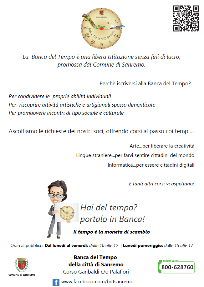 La Banca del Tempo è aperta dal Lunedì al Venerdi dalle ore 10,00 alle ore 12,00 l’accesso alla Banca è presso l’Urp. Per informazioni Contattare l'URP - 0184 580422 - 421 - 368.